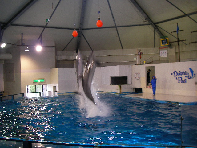 イルカ達が、ジャンプしたり尾びれでバシャバシャ水しぶきをあげて