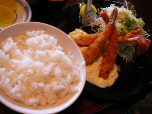 息子っちは何を思ったのか、エビフライ定食を頼んでも、餃子も付いてくる