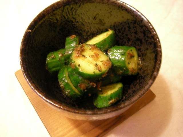 ○ ビニール袋にきゅうり、めんつゆ、かつお節を適当にいれて