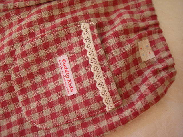 生地は、ホビークラフトショップSHさんの ダークチェリーというお色のチェック(綿麻)です。